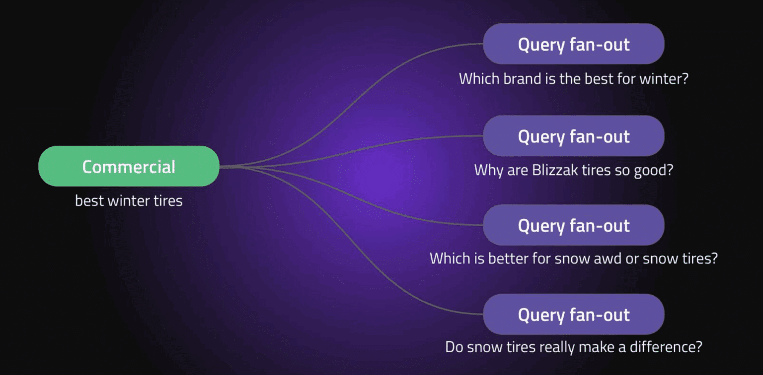 AI モードの登場とともに、もう一つ重要なテーマが本格的に議論され始めました。それがクエリ・ファンアウトです。クエリ・ファンアウトとは、AI 検索において、バックグラウンドで実行される追加の検索クエリのことです。