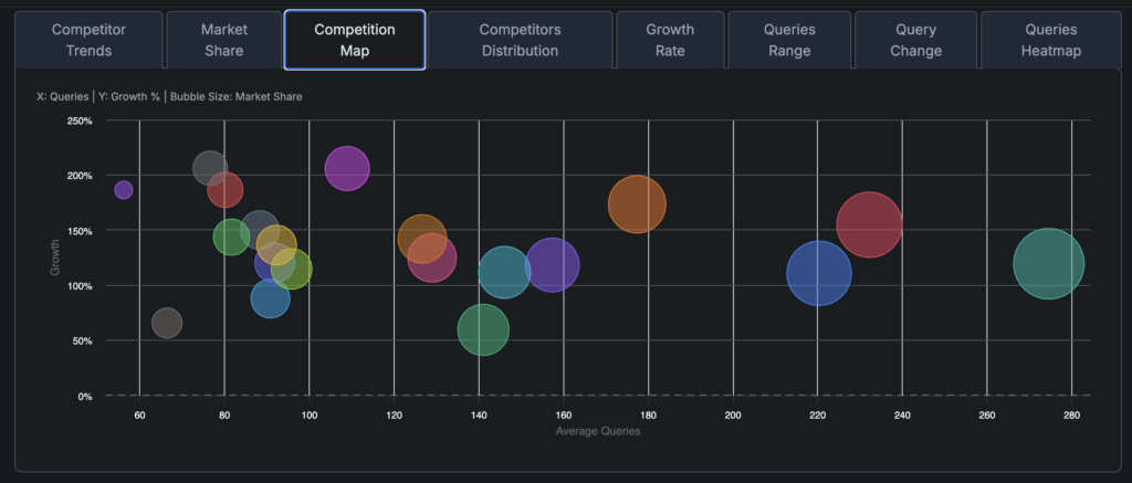 線グラフはトレンドチャートで、サイトごとの勢いがわかりやすく表現されています。そも他にもバブルチャートや積み上げグラフなど、ぱっと見で競合の成長率などが把握できるグラフがあります。 これまで把握しきれなかった競合のランクイン状況や、自社とのシェアの差を迅速に特定することが可能です。
