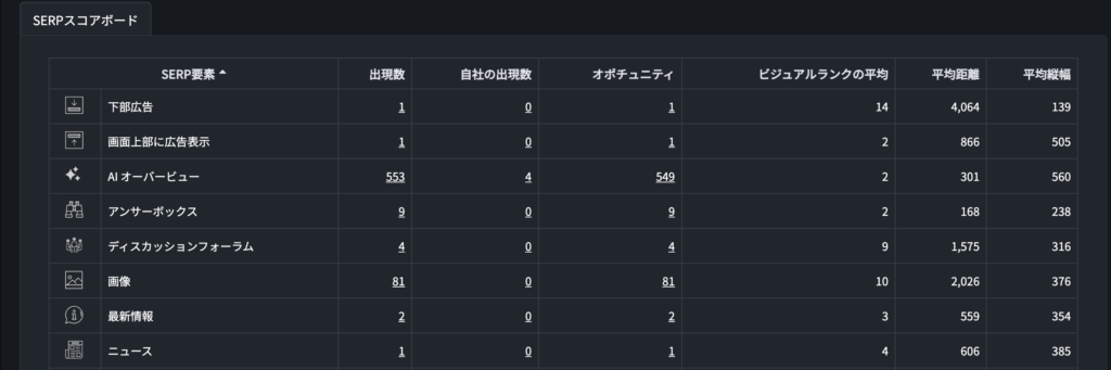 表の「自社の出現数」では、そのスニペットで自社サイトが引用されたキーワード数も確認することが可能です。流入数増減の分析にも役立てることができます。
